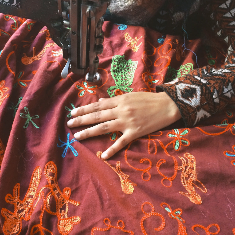 Embroidery is created stitch by stitch, often in community settings or from artisans’ homes.
