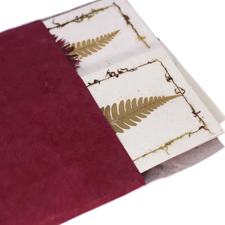 This handcrafted natural flowers postcards set is made from real flowers and leaves and Lokta bushes, which grow on the southern slopes of the Nepali Himalayas between 5,250 and 13000 feet. When properly cut, the bushes can produce three to eight new, fast-growing shoots making Lokta paper one of the most renewable and eco-friendly non-tree papers. Being used anciently for sacred texts, Lokta paper has been a staple of Nepalese artisans for centuries. Lokta paper has a beautiful texture containing natural flecks from the bush and can vary slightly in thickness from page to page due to the unique handcrafting process. Includes 8 cards & 8 envelopes.