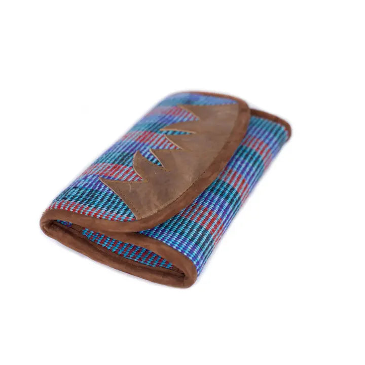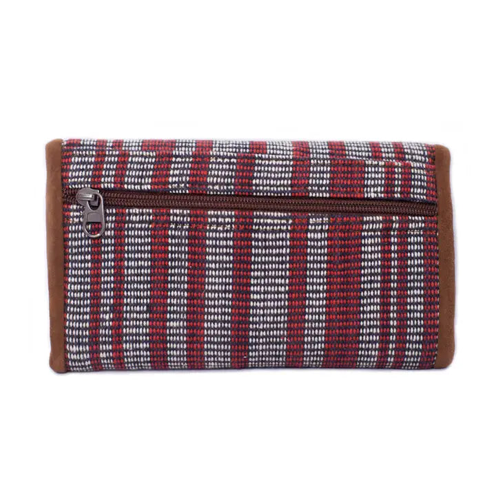 This beautifully designed Sunshine Wallet is made from handwoven cotton and recycled leather, which are environmentally friendly materials. The product has a colorful cotton stripe with a zippered main compartment, smaller zippered outer pocket and a zippered inner pocket.