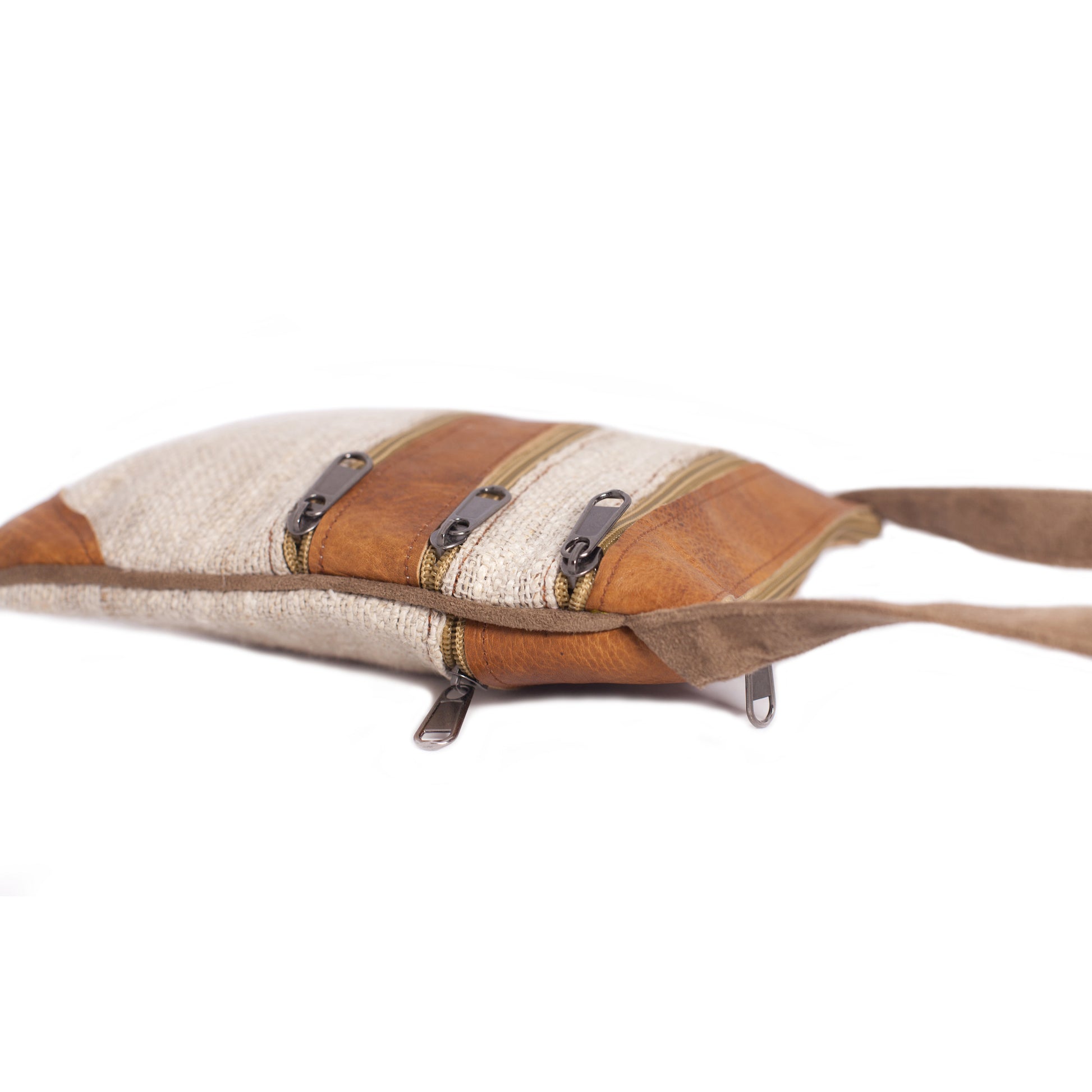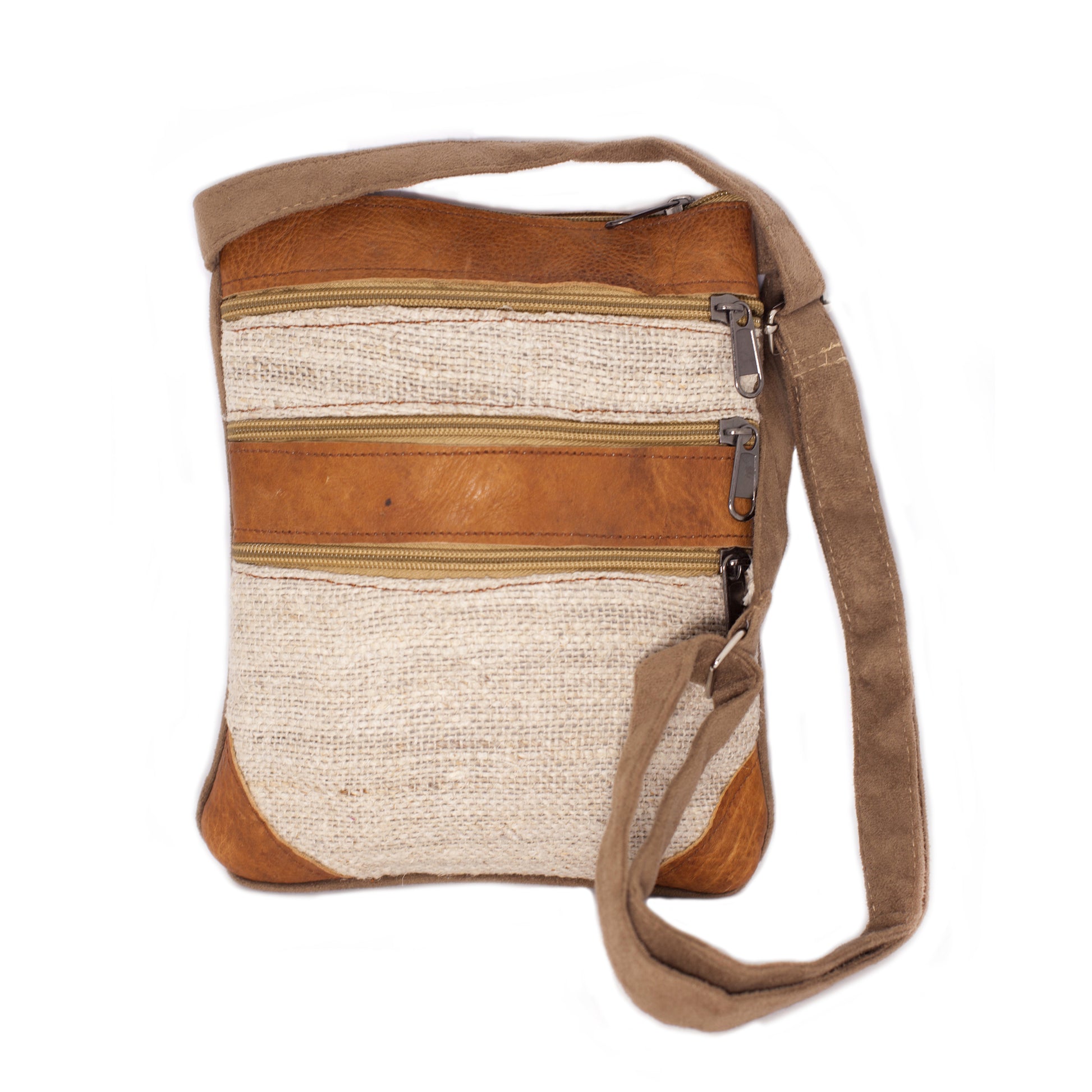 This beautifully handcrafted handbag is made from hemp, an environmentally friendly and natural material, and leather. The handbags are a lovely natural cream colour, which is 100% hemp, and a natural brown leather. The bag has 4 zipped pockets in total plus the main zipped compartment. There is a large zipped pocket on the front of the bag and 2 overlying smaller zipped pockets (still of very good size), there is also a large zipped pocket on the back of the bag. The strap of the bag is adjustable length.