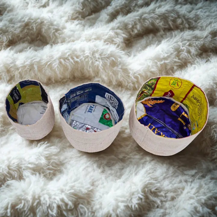 Handwoven and durable plant pot cover made from environmentally friendly material: the outside is made of handwoven Hemp fabric and the inside is made from recycled waterproof rice bags. Each piece is unique, handmade by our women using recycled fabrics. Therefore you will receive a selection of random colors and patterns.