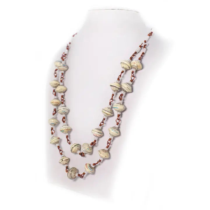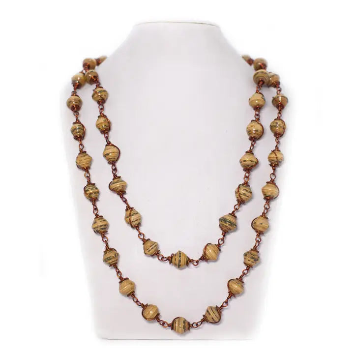 This mala necklace is handcrafted from rolled paper beads, each formed by tightly coiling printed paper into rounded shapes that show subtle layers and traces of text or color, giving every bead a unique, organic appearance. The beads are sealed for durability and strung together with copper-toned metal links and small spacer beads, creating a warm contrast against the light paper tones. Designed as a double-strand necklace, it blends traditional mala symbolism with decorative jewelry styling, reflecting mindfulness, transformation, and sustainability through the use of recycled materials and careful handcrafting.