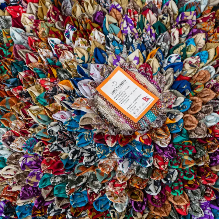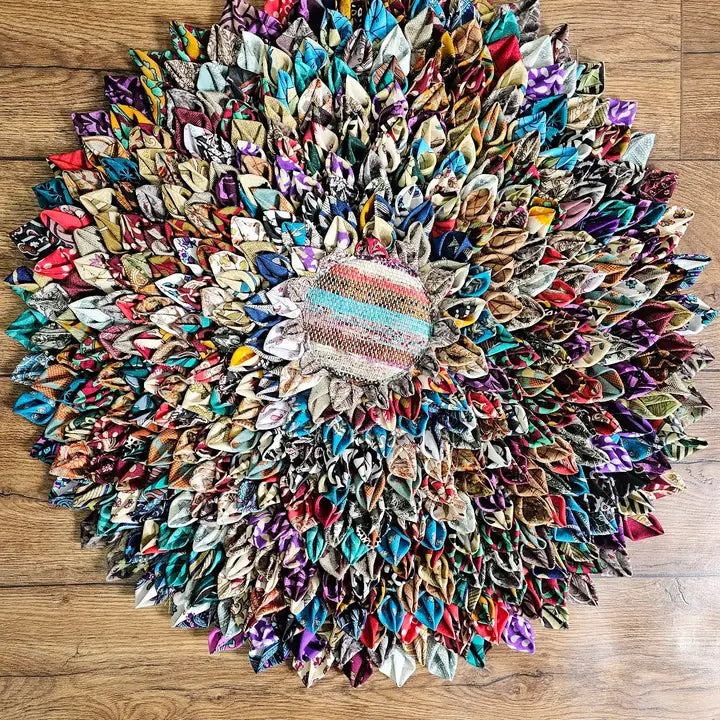 This unique looking leaf round chakati is made from recycled silk fabric. There are more than 1000 beautifully designed leaf with varieties of color in the mat. It took 6 hours to our women to manufacture this mat with the help of 7 women.